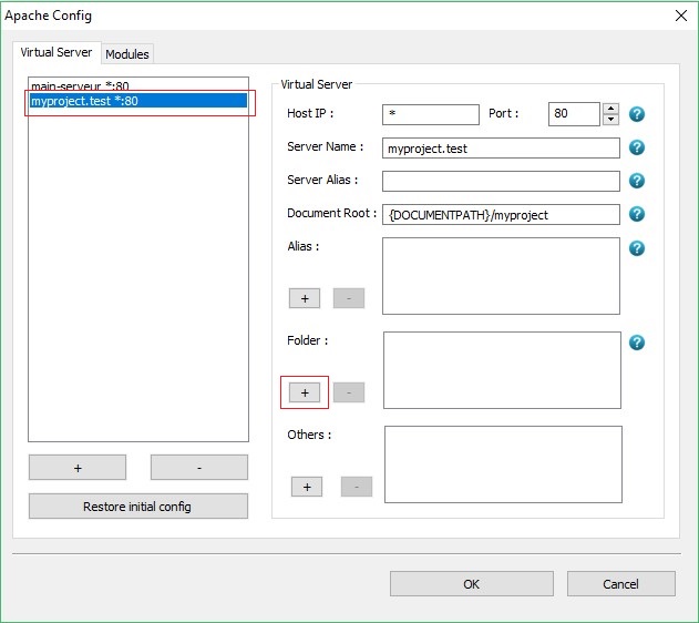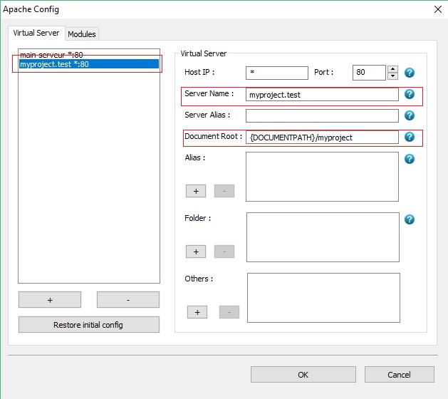 DocumentRoot - the folder we want to use as root, where {DOCUMENTPATH} is the path to the root public folder automatically generated by UwAmp and /myproject is a folder in the www directory.