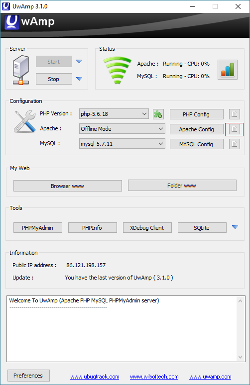After downloading the archive, unzip the files and run the program file UwAmp.exe. This will bring up the control panel and should automatically start the Apache and MySQL servers. Don`t run UwAmp.exe directly from the archive, as you won`t be able to create the necessary files for your web application.