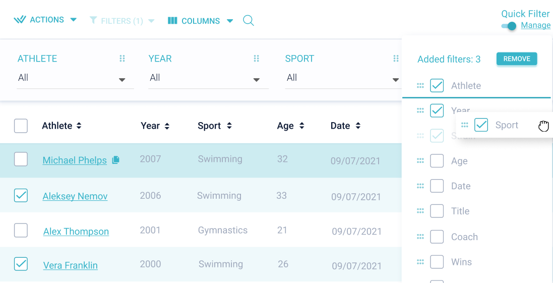- Sorting columns in ascending or descending order (Tip: displaying sort icons on all the columns all the time can clutter the design. A simple solution is to show the sort icons only on hover or when they are active.
